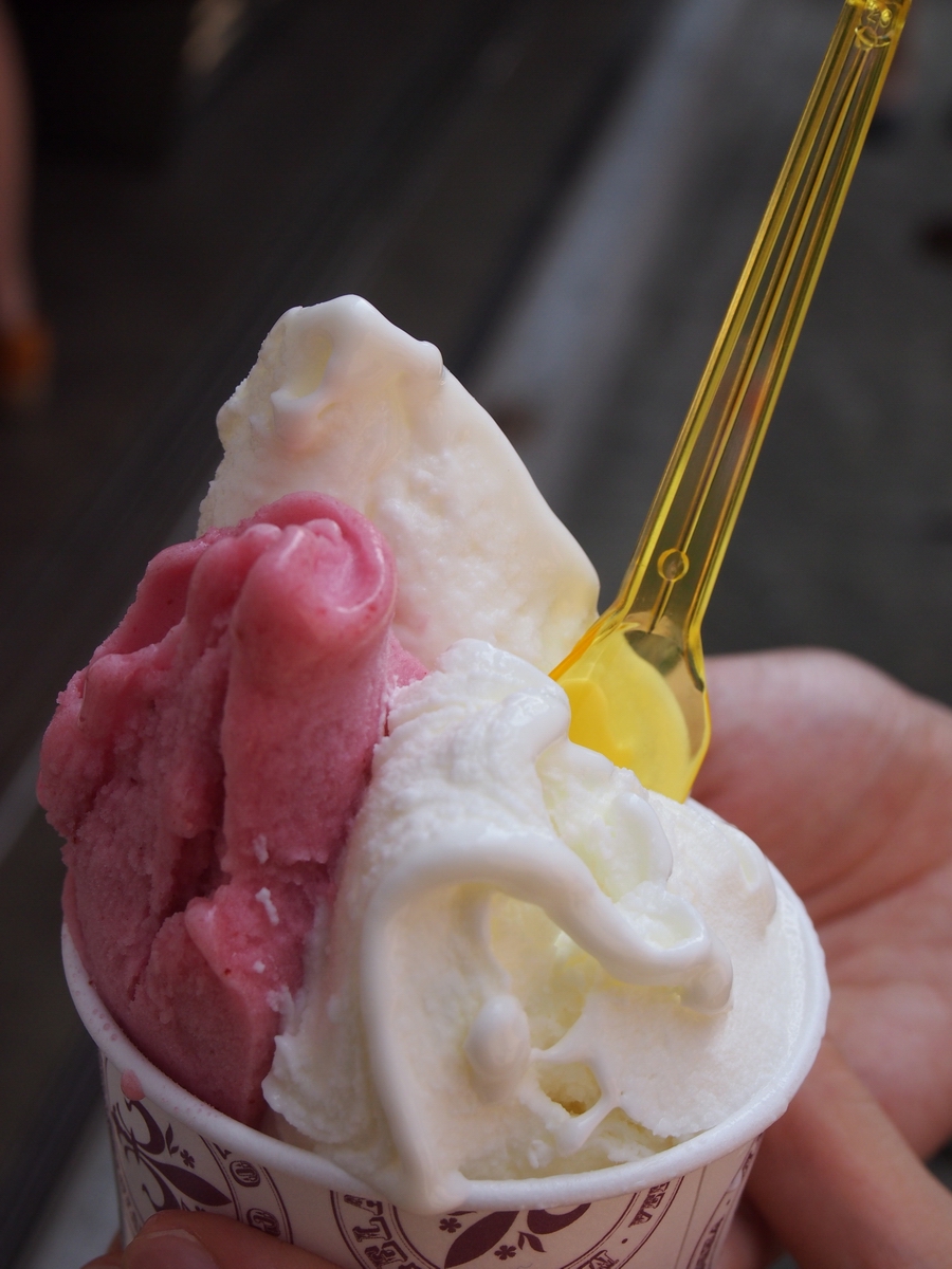 一番人気のさわやかミルク、と2番人気のヨーグルト。そして赤桃の3種類を注文しました。