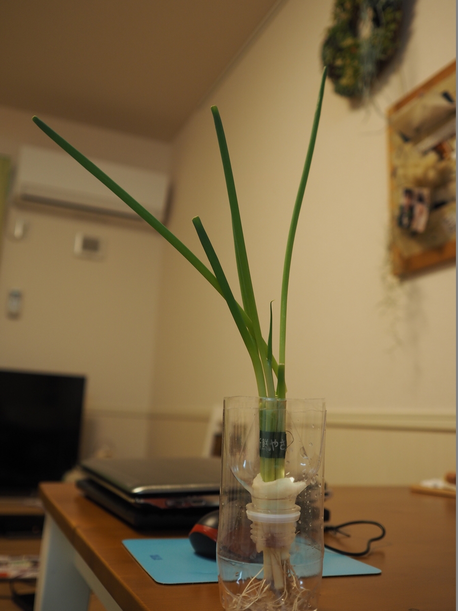 ちょうど1週間前から育て始めたスーパーのネギ。