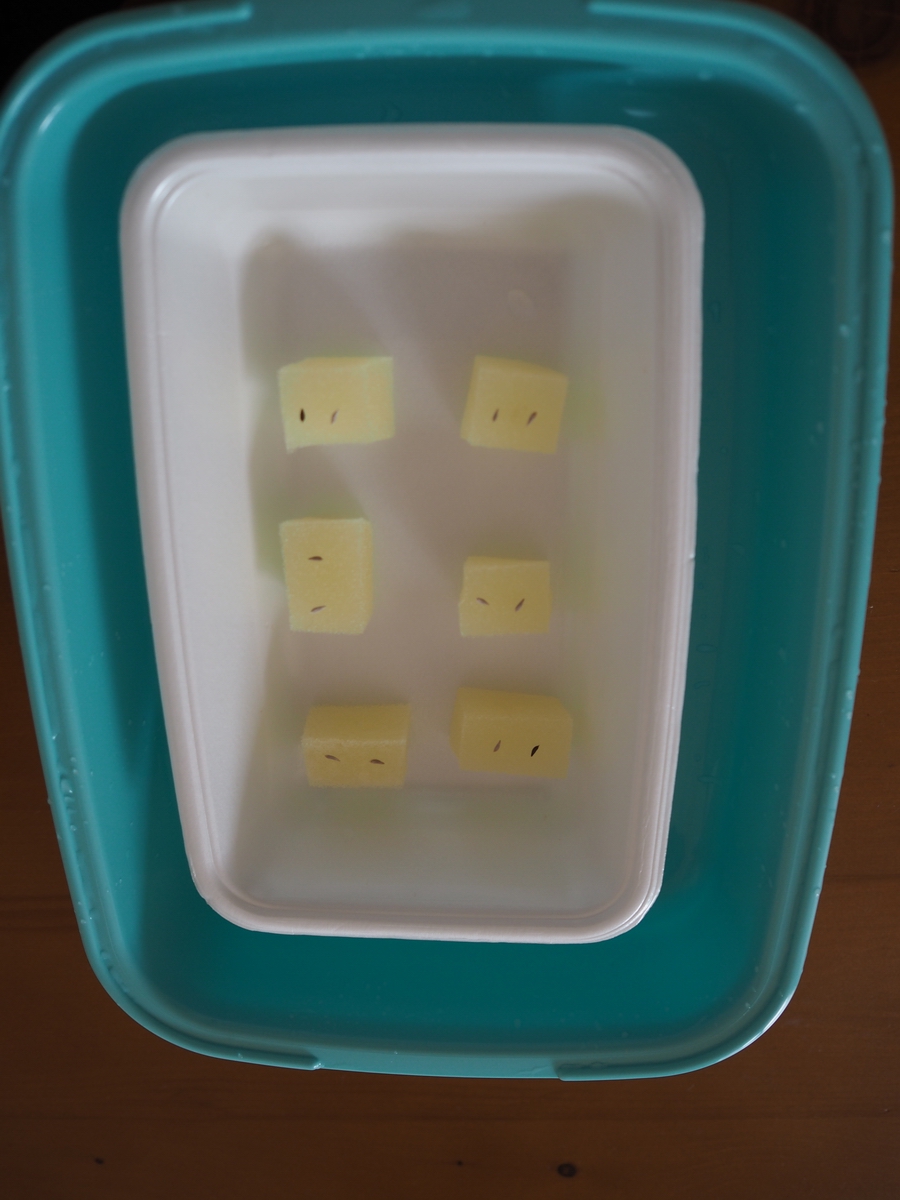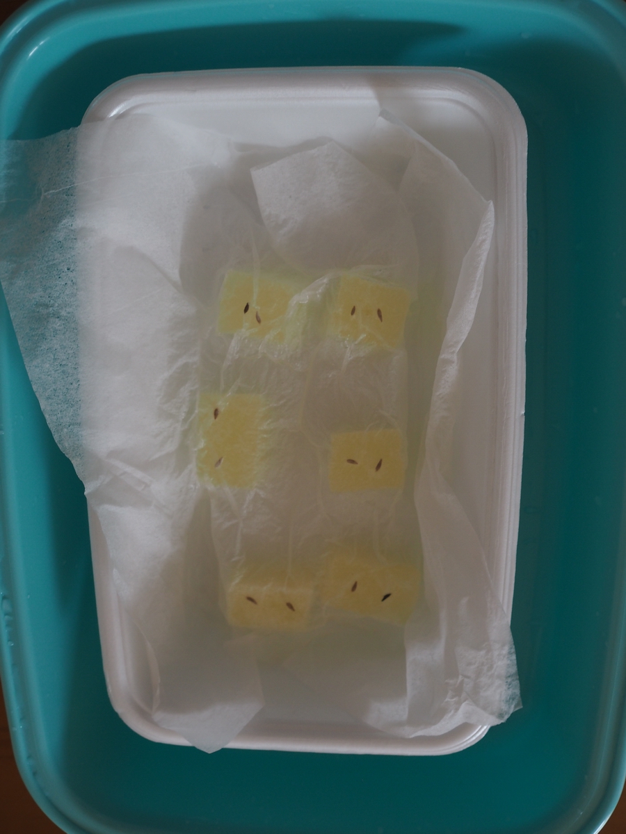 そのまま陽にもあてずに育てているのでカイワレダイコンのような貧弱な芽が育ってます。